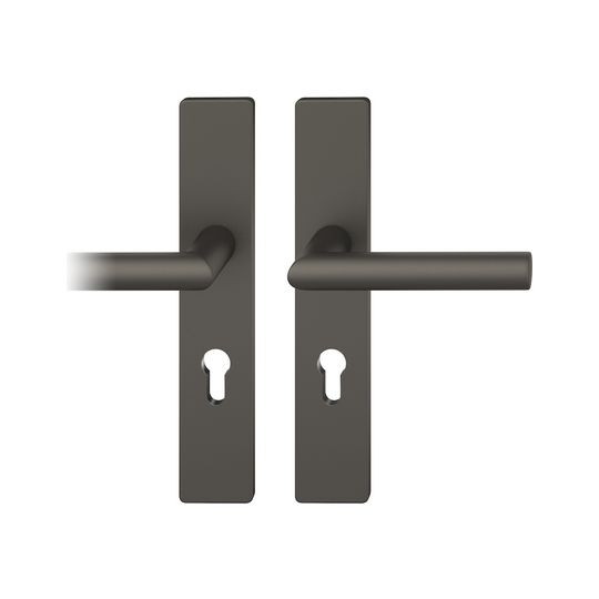 FSB Drückergarnitur 12 1076; Produkttyp: Drückergarnitur; Produkttyp (Hersteller): Drückergarnitur; Ausführung: Langschild; Befestigungsart: verdeckt verschraubt; Befestigungstechnik: mit Stütznocken; Form: eckig; Vierkant: 8 mm; Material: Aluminium; Material Unterkonstruktion: Kunststoff-Edelstahl verstärkt; Form Türgriff (innen): L-Form; Form Türgriff (außen): L-Form; Durchmesser Türgriff (innen): 21 mm; Durchmesser Türgriff (außen): 21 mm; Länge Türgriff (innen): 137 mm; Länge Türgriff (außen): 137 mm; Höhe Türgriff (innen): 58 mm; Höhe Türgriff (außen): 58 mm; Schildbreite außen: 45 mm; Schildbreite innen: 45 mm; Schildlänge außen: 245 mm; Schildlänge innen: 245 mm; Schildstärke außen: 7 mm; Schildstärke innen: 7 mm; Lagerung: Adapter-Standardlager,festdrehbar; Einsatzbereich: Haustür; Türart: Vollblatt; Türwerkstoff: Holz,Stahl; Norm: DIN EN 1906; Lochung: Profilzylinder gelocht; Entfernung: 92 mm; DIN-Richtung: DIN Links-Rechts; Farbe: braun; Farbton: dunkelbronzefarbig; Oberfläche: gestrahlt,eloxiert; Ausführung Vierkant: Stabilstift; Betätigungswinkel max.: 45 °; Türstärke min.: 39 mm; Türstärke max.: 58 mm