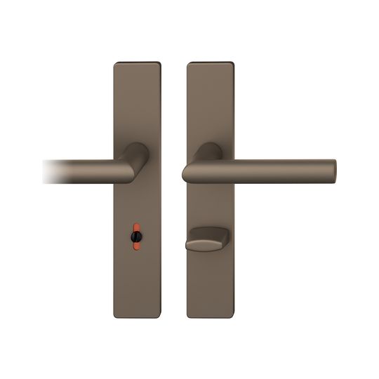 FSB Drückergarnitur 12 1076; Produkttyp: Drückergarnitur; Produkttyp (Hersteller): Drückergarnitur; Ausführung: Langschild; Befestigungsart: verdeckt verschraubt; Befestigungstechnik: mit Stütznocken; Form: eckig; Vierkant: 8 mm; Material: Aluminium; Material Unterkonstruktion: Kunststoff-Edelstahl verstärkt; Form Türgriff (innen): L-Form; Form Türgriff (außen): L-Form; Durchmesser Türgriff (innen): 21 mm; Durchmesser Türgriff (außen): 21 mm; Länge Türgriff (innen): 137 mm; Länge Türgriff (außen): 137 mm; Höhe Türgriff (innen): 58 mm; Höhe Türgriff (außen): 58 mm; Schildbreite außen: 45 mm; Schildbreite innen: 45 mm; Schildlänge außen: 245 mm; Schildlänge innen: 245 mm; Schildstärke außen: 7 mm; Schildstärke innen: 7 mm; Lagerung: Adapter-Standardlager,festdrehbar; Einsatzbereich: Zimmertür; Türart: Vollblatt; Türwerkstoff: Holz,Stahl; Norm: DIN EN 1906; Lochung: WC Schauscheibe/Schlitzkopf; Entfernung: 78 mm; Riegel-Vierkant: 8 mm; DIN-Richtung: DIN Links-Rechts; Farbe: braun; Farbton: mittelbronzefarbig; Oberfläche: gestrahlt,eloxiert; Ausführung Vierkant: Stabilstift; Betätigungswinkel max.: 45 °; Türstärke min.: 39 mm; Türstärke max.: 58 mm