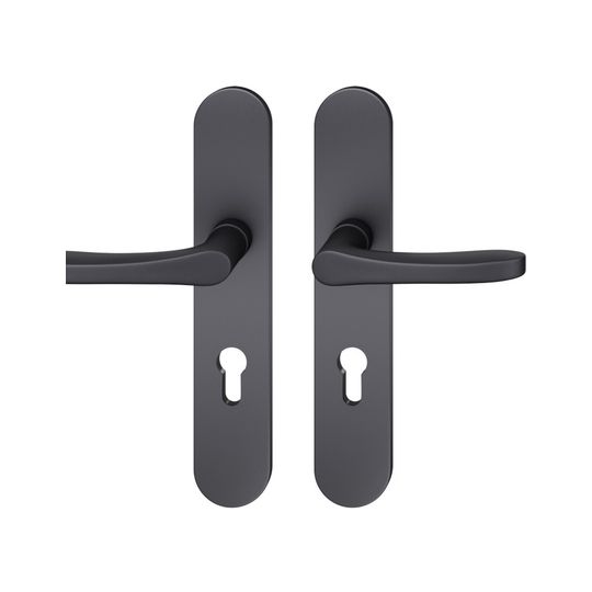 FSB Drückergarnitur 12 1106; Produkttyp: Drückergarnitur; Produkttyp (Hersteller): Drückergarnitur; Ausführung: Langschild; Befestigungsart: verdeckt verschraubt; Befestigungstechnik: mit Stütznocken; Form: oval; Vierkant: 8 mm; Material: Aluminium; Material Unterkonstruktion: Kunststoff-Edelstahl verstärkt; Form Türgriff (innen): gebogen; Form Türgriff (außen): gebogen; Länge Türgriff (innen): 119 mm; Länge Türgriff (außen): 119 mm; Höhe Türgriff (innen): 61 mm; Höhe Türgriff (außen): 61 mm; Schildbreite außen: 45 mm; Schildbreite innen: 45 mm; Schildlänge außen: 245 mm; Schildlänge innen: 245 mm; Schildstärke außen: 7 mm; Schildstärke innen: 7 mm; Lagerung: Adapter-Standardlager,festdrehbar; Einsatzbereich: Zimmertür; Türart: Vollblatt; Türwerkstoff: Holz,Stahl; Norm: DIN EN 1906; Lochung: Profilzylinder gelocht; Entfernung: 72 mm; DIN-Richtung: DIN Links-Rechts; Farbe: schwarz; Oberfläche: gestrahlt,eloxiert; Design Türdrücker: Christoph Mäckler; Ausführung Vierkant: Stabilstift; Betätigungswinkel max.: 45 °; Türstärke min.: 39 mm; Türstärke max.: 58 mm