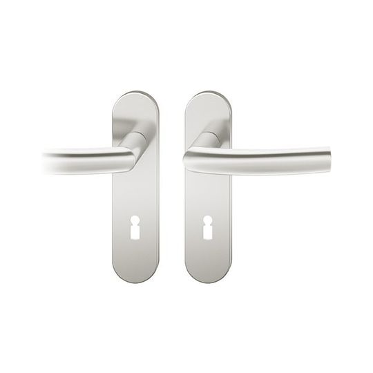 FSB Drückergarnitur 12 1107; Produkttyp: Drückergarnitur; Produkttyp (Hersteller): Drückergarnitur; Ausführung: Kurzschild; Befestigungsart: verdeckt verschraubt; Befestigungstechnik: mit Stütznocken; Form: oval; Vierkant: 8 mm; Material: Aluminium; Material Unterkonstruktion: Kunststoff; Form Türgriff (innen): Gehrung,gebogen; Form Türgriff (außen): Gehrung,gebogen; Breite Türgriff (innen): 24 mm; Breite Türgriff (außen): 24 mm; Länge Türgriff (innen): 136 mm; Länge Türgriff (außen): 136 mm; Höhe Türgriff (innen): 59 mm; Höhe Türgriff (außen): 59 mm; Schildbreite außen: 45 mm; Schildbreite innen: 45 mm; Schildlänge außen: 185 mm; Schildlänge innen: 185 mm; Schildstärke außen: 7 mm; Schildstärke innen: 7 mm; Lagerung: Adapter-Standardlager,festdrehbar; Einsatzbereich: Zimmertür; Türart: Vollblatt; Türwerkstoff: Holz,Stahl; Norm: DIN EN 1906; Lochung: Buntbart gelocht; Entfernung: 72 mm; DIN-Richtung: DIN Links-Rechts; Farbe: silber; Farbton: naturfarben; Oberfläche: eloxiert; Design Türdrücker: Hartmut Weise; Ausführung Vierkant: Stabilstift; Betätigungswinkel max.: 45 °; Türstärke min.: 39 mm; Türstärke max.: 58 mm