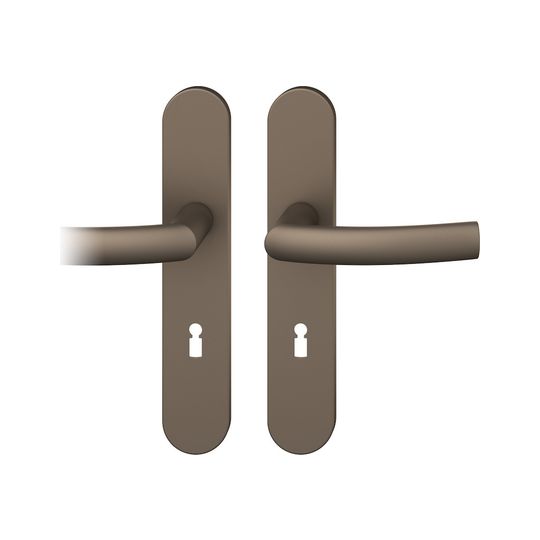 FSB Drückergarnitur 12 1107; Produkttyp: Drückergarnitur; Produkttyp (Hersteller): Drückergarnitur; Ausführung: Langschild; Befestigungsart: verdeckt verschraubt; Befestigungstechnik: mit Stütznocken; Form: oval; Vierkant: 8 mm; Material: Aluminium; Material Unterkonstruktion: Kunststoff-Edelstahl verstärkt; Form Türgriff (innen): Gehrung,gebogen; Form Türgriff (außen): Gehrung,gebogen; Breite Türgriff (innen): 24 mm; Breite Türgriff (außen): 24 mm; Länge Türgriff (innen): 136 mm; Länge Türgriff (außen): 136 mm; Höhe Türgriff (innen): 59 mm; Höhe Türgriff (außen): 59 mm; Schildbreite außen: 45 mm; Schildbreite innen: 45 mm; Schildlänge außen: 245 mm; Schildlänge innen: 245 mm; Schildstärke außen: 7 mm; Schildstärke innen: 7 mm; Lagerung: Adapter-Standardlager,festdrehbar; Einsatzbereich: Zimmertür; Türart: Vollblatt; Türwerkstoff: Holz,Stahl; Norm: DIN EN 1906; Lochung: Buntbart gelocht; Entfernung: 72 mm; DIN-Richtung: DIN Links-Rechts; Farbe: braun; Farbton: mittelbronzefarbig; Oberfläche: gestrahlt,eloxiert; Design Türdrücker: Hartmut Weise; Ausführung Vierkant: Stabilstift; Betätigungswinkel max.: 45 °; Türstärke min.: 39 mm; Türstärke max.: 58 mm