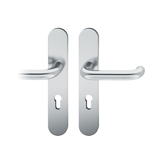 FSB Drückergarnitur 12 1146; Produkttyp: Drückergarnitur; Produkttyp (Hersteller): Drückergarnitur; Ausführung: Langschild; Befestigungsart: verdeckt verschraubt; Befestigungstechnik: mit Stütznocken; Form: oval; Vierkant: 8 mm; Material: Edelstahl; Material Unterkonstruktion: Kunststoff-Edelstahl verstärkt; Form Türgriff (innen): U-Form; Form Türgriff (außen): U-Form; Durchmesser Türgriff (innen): 20 mm; Durchmesser Türgriff (außen): 20 mm; Länge Türgriff (innen): 142 mm; Länge Türgriff (außen): 142 mm; Höhe Türgriff (innen): 63 mm; Höhe Türgriff (außen): 63 mm; Schildbreite außen: 45 mm; Schildbreite innen: 45 mm; Schildlänge außen: 245 mm; Schildlänge innen: 245 mm; Schildstärke außen: 7 mm; Schildstärke innen: 7 mm; Lagerung: Adapter-Standardlager,festdrehbar; Einsatzbereich: Haustür; Türart: Vollblatt; Türwerkstoff: Holz,Stahl; Norm: DIN EN 1906; Lochung: Profilzylinder gelocht; Entfernung: 92 mm; DIN-Richtung: DIN Links-Rechts; Farbe: grau; Farbton: edelstahl; Oberfläche: poliert; Ausführung Vierkant: Stabilstift; Betätigungswinkel max.: 45 °; Türstärke min.: 39 mm; Türstärke max.: 58 mm