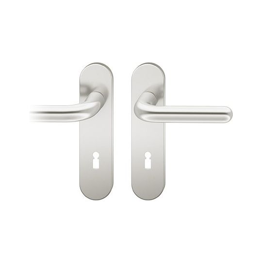 FSB Drückergarnitur 12 1147; Produkttyp: Drückergarnitur; Produkttyp (Hersteller): Drückergarnitur; Ausführung: Kurzschild; Befestigungsart: verdeckt verschraubt; Befestigungstechnik: mit Stütznocken; Form: oval; Vierkant: 8 mm; Material: Aluminium; Material Unterkonstruktion: Kunststoff; Form Türgriff (innen): gebogen; Form Türgriff (außen): gebogen; Durchmesser Türgriff (innen): 20 mm; Durchmesser Türgriff (außen): 20 mm; Länge Türgriff (innen): 132 mm; Länge Türgriff (außen): 132 mm; Höhe Türgriff (innen): 63 mm; Höhe Türgriff (außen): 63 mm; Schildbreite außen: 45 mm; Schildbreite innen: 45 mm; Schildlänge außen: 185 mm; Schildlänge innen: 185 mm; Schildstärke außen: 7 mm; Schildstärke innen: 7 mm; Lagerung: Adapter-Standardlager,festdrehbar; Einsatzbereich: Zimmertür; Türart: Vollblatt; Türwerkstoff: Holz,Stahl; Norm: DIN EN 1906; Lochung: Buntbart gelocht; Entfernung: 72 mm; DIN-Richtung: DIN Links-Rechts; Farbe: silber; Farbton: naturfarben; Oberfläche: eloxiert; Ausführung Vierkant: Stabilstift; Betätigungswinkel max.: 45 °; Türstärke min.: 39 mm; Türstärke max.: 58 mm
