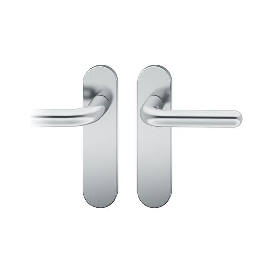 FSB Drückergarnitur 12 1147; Produkttyp: Drückergarnitur; Produkttyp (Hersteller): Drückergarnitur; Ausführung: Kurzschild; Befestigungsart: verdeckt verschraubt; Befestigungstechnik: mit Stütznocken; Form: oval; Vierkant: 8 mm; Material: Edelstahl; Material Unterkonstruktion: Kunststoff; Form Türgriff (innen): gebogen; Form Türgriff (außen): gebogen; Durchmesser Türgriff (innen): 20 mm; Durchmesser Türgriff (außen): 20 mm; Länge Türgriff (innen): 132 mm; Länge Türgriff (außen): 132 mm; Höhe Türgriff (innen): 63 mm; Höhe Türgriff (außen): 63 mm; Schildbreite außen: 45 mm; Schildbreite innen: 45 mm; Schildlänge außen: 185 mm; Schildlänge innen: 185 mm; Schildstärke außen: 7 mm; Schildstärke innen: 7 mm; Lagerung: Adapter-Standardlager,festdrehbar; Einsatzbereich: Zimmertür; Türart: Vollblatt; Türwerkstoff: Holz,Stahl; Norm: DIN EN 1906; Lochung: ungelocht; DIN-Richtung: DIN Links-Rechts; Farbe: grau; Farbton: edelstahl; Oberfläche: fein matt; Ausführung Vierkant: Stabilstift; Betätigungswinkel max.: 45 °; Türstärke min.: 39 mm; Türstärke max.: 58 mm