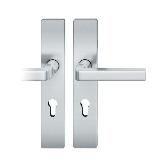 FSB Drückergarnitur 72 1004; Produkttyp: Drückergarnitur; Produkttyp (Hersteller): Drückergarnitur; Ausführung: Langschild; Befestigungsart: verdeckt verschraubt; Befestigungstechnik: mit Stütznocken; Form: eckig; Vierkant: 8 mm; Material: Edelstahl; Form Türgriff (innen): Design; Form Türgriff (außen): Design; Breite Türgriff (innen): 19 mm; Breite Türgriff (außen): 19 mm; Länge Türgriff (innen): 133 mm; Länge Türgriff (außen): 133 mm; Höhe Türgriff (innen): 58 mm; Höhe Türgriff (außen): 58 mm; Schildbreite außen: 45 mm; Schildbreite innen: 45 mm; Schildlänge außen: 245 mm; Schildlänge innen: 245 mm; Schildstärke außen: 7 mm; Schildstärke innen: 7 mm; Lagerung: Ausgleichslager® 3,mit Rückholfeder,festdrehbar; Einsatzbereich: Zimmertür; Türart: Vollblatt; Türwerkstoff: Holz,Stahl; Norm: DIN EN 1906; Lochung: Profilzylinder gelocht; Entfernung: 72 mm; DIN-Richtung: DIN Links; Farbe: grau; Farbton: edelstahl; Oberfläche: fein matt; Design Türdrücker: David Chipperfield; Betätigungswinkel max.: 35 °; Türstärke min.: 39 mm; Türstärke max.: 48 mm