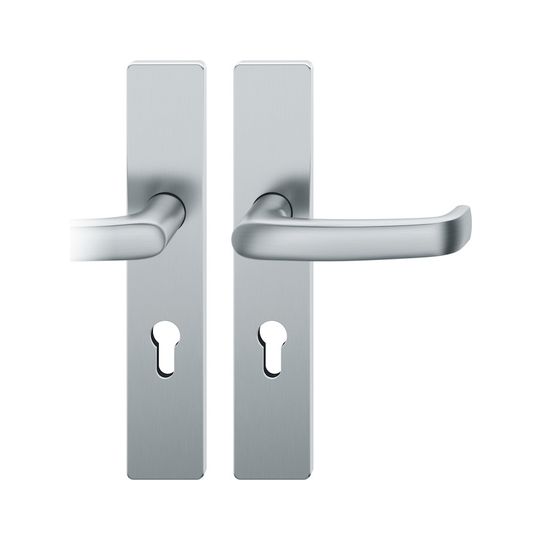 FSB Drückergarnitur 72 1045; Produkttyp: Drückergarnitur; Produkttyp (Hersteller): Drückergarnitur; Ausführung: Langschild; Befestigungsart: verdeckt verschraubt; Befestigungstechnik: mit Stütznocken; Form: eckig; Vierkant: 8 mm; Material: Edelstahl; Form Türgriff (innen): gebogen; Form Türgriff (außen): gebogen; Breite Türgriff (innen): 22 mm; Breite Türgriff (außen): 22 mm; Länge Türgriff (innen): 132 mm; Länge Türgriff (außen): 132 mm; Höhe Türgriff (innen): 55 mm; Höhe Türgriff (außen): 55 mm; Schildbreite außen: 45 mm; Schildbreite innen: 45 mm; Schildlänge außen: 245 mm; Schildlänge innen: 245 mm; Schildstärke außen: 7 mm; Schildstärke innen: 7 mm; Lagerung: Ausgleichslager® 3,mit Rückholfeder,festdrehbar; Einsatzbereich: Zimmertür; Türart: Vollblatt; Türwerkstoff: Holz,Stahl; Norm: DIN EN 1906; Lochung: Profilzylinder gelocht; Entfernung: 72 mm; DIN-Richtung: DIN Links; Farbe: grau; Farbton: edelstahl; Oberfläche: fein matt; Betätigungswinkel max.: 35 °; Türstärke min.: 39 mm; Türstärke max.: 48 mm