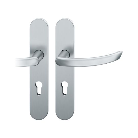 FSB Drückergarnitur 72 1119; Produkttyp: Drückergarnitur; Produkttyp (Hersteller): Drückergarnitur; Ausführung: Langschild; Befestigungsart: verdeckt verschraubt; Befestigungstechnik: mit Stütznocken; Form: oval; Vierkant: 8 mm; Material: Edelstahl; Form Türgriff (innen): gebogen; Form Türgriff (außen): gebogen; Breite Türgriff (innen): 23 mm; Breite Türgriff (außen): 23 mm; Länge Türgriff (innen): 149 mm; Länge Türgriff (außen): 149 mm; Höhe Türgriff (innen): 63 mm; Höhe Türgriff (außen): 63 mm; Schildbreite außen: 45 mm; Schildbreite innen: 45 mm; Schildlänge außen: 245 mm; Schildlänge innen: 245 mm; Schildstärke außen: 7 mm; Schildstärke innen: 7 mm; Lagerung: Ausgleichslager® 3,mit Rückholfeder,festdrehbar; Einsatzbereich: Zimmertür; Türart: Vollblatt; Türwerkstoff: Holz,Stahl; Norm: DIN EN 1906; Lochung: Profilzylinder gelocht; Entfernung: 72 mm; DIN-Richtung: DIN Rechts; Farbe: grau; Farbton: edelstahl; Oberfläche: fein matt; Design Türdrücker: Hartmut Weise; Betätigungswinkel max.: 35 °; Türstärke min.: 39 mm; Türstärke max.: 48 mm