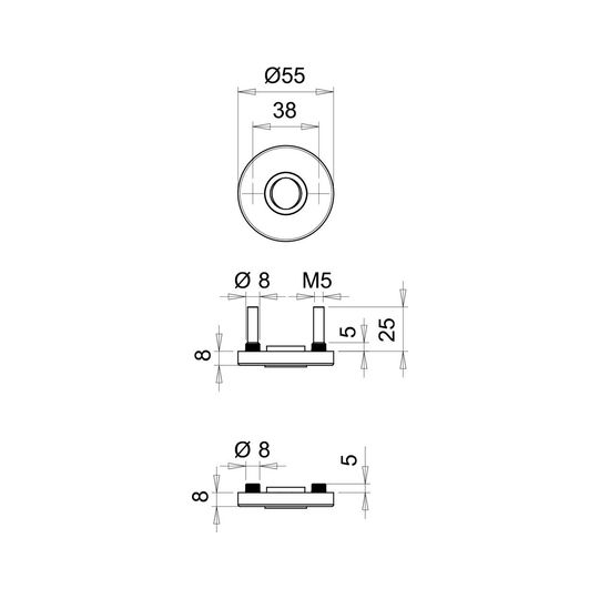 EDI Drückerrosettenpaar 1051; Produkttyp: Drückerrosettenpaar; Produkttyp (Hersteller): Drückerrosettenpaar; Anwendung: außen/innen; Form: rund; Befestigungsart: verdeckt verschraubt; Material: Aluminium; Durchmesser: 55 mm; Befestigungsabstand: 38 mm; Material Unterkonstruktion: Stahl; Einsatzbereich: Tür; Türart: Vollblatt; Farbe: silber; Farbton: naturfarben; Oberfläche: eloxiert; Stütznocken: mit Stütznocken; Türstärke min.: 35 mm; Türstärke max.: 58 mm
