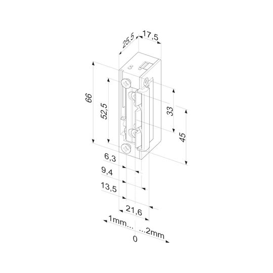 effeff Elektro-Türöffner 118.13B; Bauform: symmetrisch; Einbaulage: senkrecht,waagerecht; Befestigungsart: zum Einlassen; Entriegelung: ohne; Norm: DIN EN 14846; Einsatzbereich: Türrahmen; Basis: Elektro-Türöffner; Ausführung: ohne Schließblech; DIN-Richtung: DIN Links-Rechts; Funktion: Arbeitsstrom; Stromart: AC/DC; Stromanschluss: klemmbar,steckbar; Spannungsart: AC/DC; kompatibel: zu Standard Einsteckschloss,zu Schließblech PROFIX®2; Öffnerbreite: 18,5 mm; Öffnerhöhe: 66 mm; Betriebstemperatur min.: -15 °C; Öffnertiefe: 25,5 mm; Betriebstemperatur max.: 40 °C; Verstellbereich Falle: 3 mm; Aufbruchfestigkeit: 3.750 N; Spannung min.: 10 V; Spannung max.: 24 V; Nennwiderstand: 43 O; Türflügelanzahl: einflügelig; Türart: Abschlusstür; Türausprägung: Türe gefälzt,Türe stumpf; Rahmenwerkstoff: Aluminium,Kunststoff,Holz; Falleneigenschaft: verstellbar; Falleneingrifftiefe: 5,5 mm; Dauerstromfest DC min.: 11 V; Dauerstromfest DC max.: 13 V; Stromaufnahme AC bei 12V: 250 mA; Stromaufnahme AC bei 24V: 500 mA; Stromaufnahme DC bei 12V: 280 mA; Stromaufnahme DC bei 24V: 560 mA; Fallenvorlast AC max. bei 12V: 200 N; Fallenvorlast AC max. bei 24V: >350 N; Fallenvorlast DC max. bei 12V: 50 N; Fallenvorlast DC max. bei 24V: 200 N; Zusatzinformation: für PVC-Profile