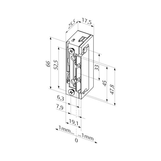effeff Elektro-Türöffner 118E.15; Bauform: symmetrisch; Einbaulage: waagerecht,senkrecht; Befestigungsart: zum Einlassen; Entriegelung: mechanisch; Norm: DIN EN 14846; Einsatzbereich: Türrahmen; Basis: Elektro-Türöffner; Ausführung: ohne Schließblech; DIN-Richtung: DIN Links-Rechts; Funktion: Arbeitsstrom; Stromart: AC/DC; Stromanschluss: klemmbar,steckbar; Spannungsart: AC/DC; kompatibel: zu Standard Einsteckschloss,zu Schließblech PROFIX®2; Öffnerbreite: 17,5 mm; Öffnerhöhe: 66 mm; Betriebstemperatur min.: -15 °C; Öffnertiefe: 25,5 mm; Betriebstemperatur max.: 40 °C; Verstellbereich Falle: 3 mm; Aufbruchfestigkeit: 3.750 N; Spannung min.: 10 V; Spannung max.: 24 V; Nennwiderstand: 43 O; Türflügelanzahl: einflügelig; Türart: Abschlusstür; Türausprägung: Türe gefälzt,Türe stumpf; Rahmenwerkstoff: Holz,Aluminium,Kunststoff; Falleneigenschaft: verstellbar; Falleneingrifftiefe: 5,5 mm; Dauerstromfest DC min.: 11 V; Dauerstromfest DC max.: 13 V; Stromaufnahme AC bei 12V: 250 mA; Stromaufnahme AC bei 24V: 500 mA; Stromaufnahme DC bei 12V: 280 mA; Stromaufnahme DC bei 24V: 560 mA; Fallenvorlast AC max. bei 12V: 200 N; Fallenvorlast AC max. bei 24V: >350 N; Fallenvorlast DC max. bei 12V: 50 N; Fallenvorlast DC max. bei 24V: 200 N