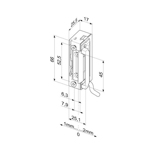effeff Elektro-Türöffner 118WE10; Bauform: symmetrisch; Einbaulage: senkrecht,waagerecht; Befestigungsart: zum Einlassen; Entriegelung: mechanisch; Norm: DIN EN 14846; Einsatzbereich: Türrahmen; Basis: Elektro-Türöffner; Ausführung: ohne Schließblech,mit Diode; DIN-Richtung: DIN Links-Rechts; Funktion: Arbeitsstrom; Stromart: AC/DC; Stromanschluss: klemmbar,steckbar; Spannungsart: AC/DC; kompatibel: zu Standard Einsteckschloss,zu Schließblech PROFIX®1; Zulassung: für Sonderanwendungen; Öffnerbreite: 17,5 mm; Öffnerhöhe: 66 mm; Betriebstemperatur min.: -15 °C; Öffnertiefe: 25,5 mm; Betriebstemperatur max.: 40 °C; Verstellbereich Falle: 3 mm; Aufbruchfestigkeit: 3.750 N; Spannung min.: 10 V; Spannung max.: 24 V; Nennwiderstand: 43 O; Türflügelanzahl: einflügelig; Türart: Abschlusstür; Türausprägung: Türe gefälzt,Türe stumpf; Rahmenwerkstoff: Holz,Aluminium,Kunststoff; Falleneigenschaft: verstellbar; Falleneingrifftiefe: 5,5 mm; Dauerstromfest DC min.: 11 V; Dauerstromfest DC max.: 13 V; Stromaufnahme AC bei 12V: 250 mA; Stromaufnahme AC bei 24V: 500 mA; Stromaufnahme DC bei 12V: 280 mA; Stromaufnahme DC bei 24V: 560 mA; Fallenvorlast AC max. bei 12V: 200 N; Fallenvorlast AC max. bei 24V: >350 N; Fallenvorlast DC max. bei 12V: 50 N; Fallenvorlast DC max. bei 24V: 200 N; Zusatzinformation: wassergeschützt