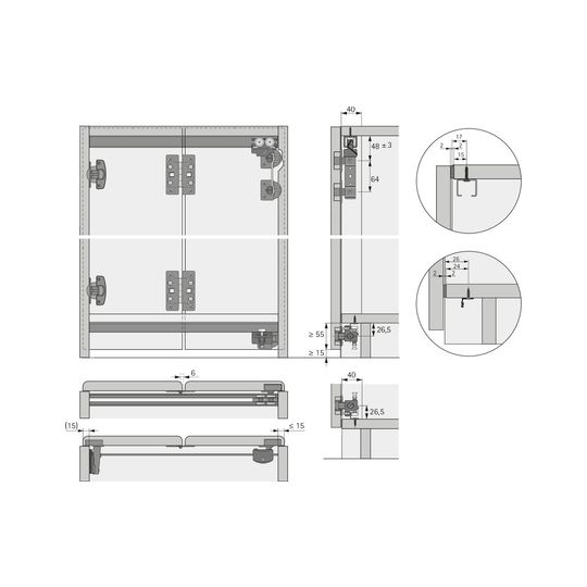 • Die lichte Korpusbreite von 800 mm sollte nicht überschritten werden. Die Oberbodenkonstruktion muss so ausgelegt sein, dass sich der Oberboden unter Belastung durch die gefalteten Türen nicht mehr als 1,5 mm durchbiegen kann.