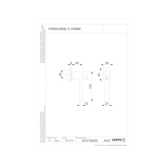 HOPPE Fenstergriff Austin 0769S/U959 100NM; Material: Aluminium; Vierkant: 7 mm; Befestigungsart: verdeckt verschraubt; Befestigungstechnik: mit Stütznocken; Lieferung: mit Schrauben,mit Vierkantstift; Einsatzbereich: Drehkipp; Basis: Fenstergriff; Ausführung: abschließbar,mit Druckzylinder; Material Unterkonstruktion: Kunststoff; DIN-Richtung: DIN Links-Rechts; Nockendurchmesser: 10 mm; Sockelbreite: 30 mm; Sockelhöhe: 61 mm; Sockelstärke: 6 mm; Stift vorstehend: 37 mm; Befestigungsabstand: 43 mm; Schließungsnummer: H001-EW; Norm: DIN EN 13126-3,DIN EN 1627-1630 (RC1-6); Oberfläche: eloxiert; Farbton: naturfarbig; Prüfung: RAL-GZ 607/9,RAL 100; Prüfung Abdrehen/Abreißen: 100 N·m; Rastung: 90°; Schließfunktion: gleichschließend,Wendeschlüssel; Griffform: gerade; Anwendung: für nach innen öffnende Fenster und Fenstertüren; Grifflänge: 137 mm; Griffhöhe: 49 mm; Schlüssel Anzahl: 1 St.; Griffbreite: 21 mm; Fensterwerkstoff: Holz,Aluminium,Kunststoff; Technik: Secu100®; Aufdruck: mit Logo; Sockelausführung: mit flacher eckiger Rosette