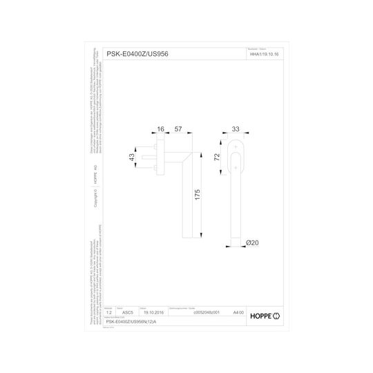HOPPE Griff Amsterdam PSK-E0400Z/US956; Ausführung: Standard; Material: Aluminium; Norm: DIN EN 13126-3,DIN EN 1670; Befestigungsart: verdeckt verschraubt; Befestigungstechnik: mit Stütznocken; Einsatzbereich: Parallelschiebekipp; Basis: Griff; Vierkant: 7 mm; DIN-Richtung: DIN Links-Rechts; Nockendurchmesser: 10 mm; Sockelbreite: 33 mm; Sockelhöhe: 72 mm; Sockelstärke: 16 mm; Befestigungsabstand: 43 mm; Funktion: mit selbsttätiger Verriegelung; Farbton: edelstahl matt; Rastung: 90°; Lieferung: mit Schrauben,mit Vierkantstift; Aufdruck: mit Logo; Griffausführung: Standard-Griff innen; Anwendung: innen; Korrosionsbeständigkeit: Klasse 4; Griffdurchmesser: 20 mm; Sockelausführung: mit ovaler Rosette; Griffform: Gehrung; Grifflänge: 175 mm; Griffhöhe: 57 mm; Zusatzinformation: Besonderheit: integrierte Basis-Sicherheit; Stift vorstehend: 32-42 mm; Fensterwerkstoff: Holz,Aluminium,Kunststoff; Material Unterkonstruktion: Kunststoff; Technik: Secustik®,VarioFit®