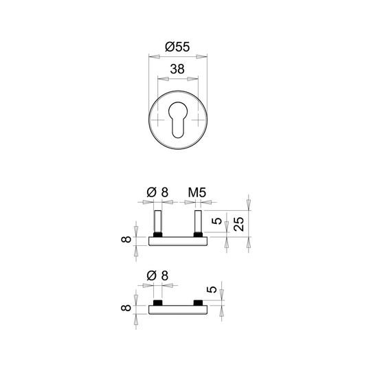 EDI Schlüsselrosettenpaar Riva 1056; Produkttyp: Schlüsselrosettenpaar; Produkttyp (Hersteller): Schlüsselrosettenpaar; Anwendung: außen/innen; Form: rund; Befestigungsart: verdeckt verschraubt; Material: Edelstahl; Durchmesser: 55 mm; Befestigungsabstand: 38 mm; Material Unterkonstruktion: Stahl; Einsatzbereich: Tür; Norm: DIN 18273,DIN EN 1906,DIN EN 179; Türart: Vollblatt; Zulassung: für Feuerschutz,für Fluchttüren,für Rauchschutz; Lochung: Profilzylinder gelocht; Farbe: grau; Farbton: edelstahl; Oberfläche: matt; Stütznocken: mit Stütznocken; Höhe: 8 mm; Türstärke min.: 38 mm; Türstärke max.: 58 mm