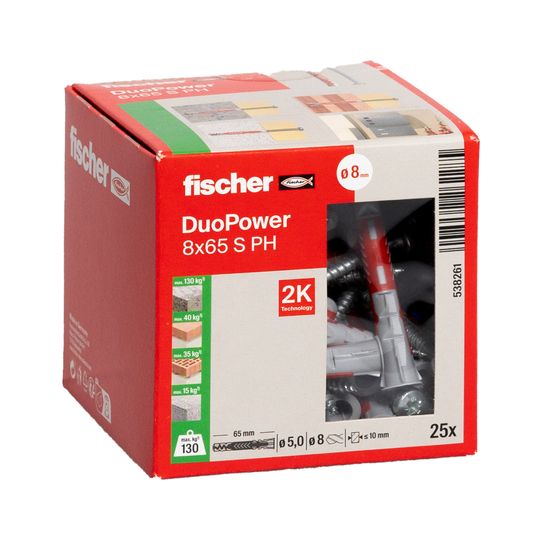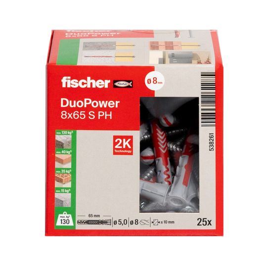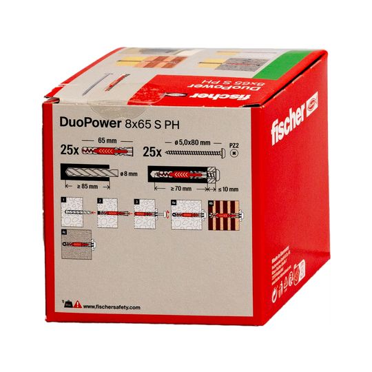 fischer DUOPOWER 8 x 65 S PH; Eigenschaft Dübel: 2K - Technologie; Sicherheitsdatenblatt: Nein; Gütesiegel: Ja; Brandprüfung: Nein; technische Dokumentation: Nein; Lastwerte: Ja; Verankerungsgrund: Gipskarton- und Gipsfaserplatten,Spanplatten,Kalksand-Vollstein,Hochlochziegel,Vollziegel,Porenbeton,Vollstein aus Leichtbeton,Hohldecken aus Ziegel, Beton o. ä.,Beton,Naturstein,Hohlblock aus Leichtbeton,Gipsbauplatte,Vollgips-Platten,Kalksand-Lochstein; Werkstoff Dübel: Kunststoff; Güte Werkstoff Dübel: Polypropylen,Nylon; Werkstoff Schraube: Stahl; Anerkennung Factory Mutual: Nein; DOP - Declaration of Performance: Nein; EPD - Umwelt Produktdeklaration: Nein; Eigenschaft Güte Werkstoff Schraube: korrosionsgeschützt; Montageart: Vorsteckmontage,Durchsteckmontage; Wirkungsweise: Reibschluss; Eigenschaft: mit passender Schraube 4,0 x 35 für perfekten Halt,Kombination aus zwei Materialkomponenten für mehr Leistung,mit passender Sicherheitsschraube 7,0 x 69 f. perfekten Halt,mit je 20 Aufkleber in schwarz, weiß braun und grau,mit passender Schraube 4,5 x 40 für perfekten Halt,mit je 10 Aufkleber in schwarz, weiß braun und grau,mit passender Schraube 5,0 x 60 für perfekten Halt,schmaler Dübelrand verhindert d. Tieferrutschen ins Bohrloch,Funktionen für Voll- (Spreizen) und Lochbaustoffe (Klappen),bestmögliche Rückmeldung des Dübels; Feuerwiderstandsklasse: keine; Oberfläche Schraube: galvanisch verzinkt; Prüfzeichen: Nein; Anwendungsbereich: Bad und WC-Einrichtungen,Dunstabzugshauben,Sanitär/Heizung/Klima-Befestigungen,TV-Konsolen,Wandregale,Hängeschränke,Waschtischbefestigungen,Leuchten,Spiegelschränke,Briefkastenanlagen,Fensterrollo,Gardinenschienen,Bilder; Inhalt: 25 x DUOPOWER 8 x 65,25 x Panheadschraube 5,0 x 80; Bohrernenndurchmesser: 8 mm; Länge Dübel: 65