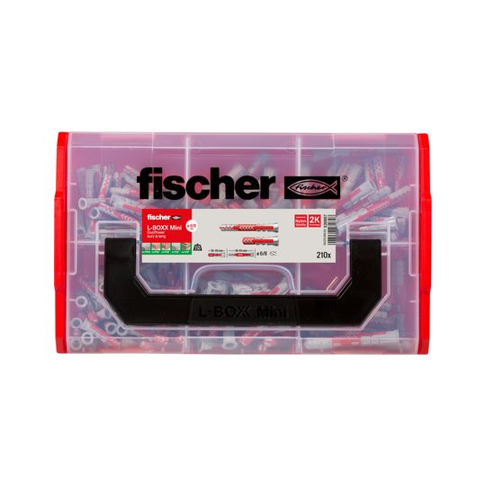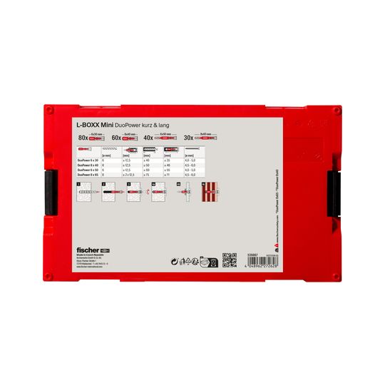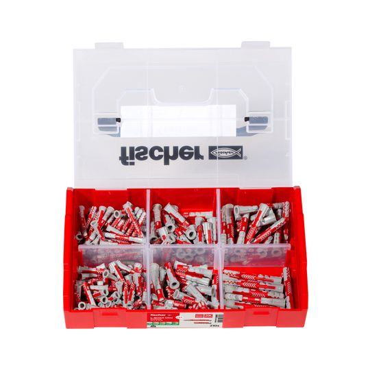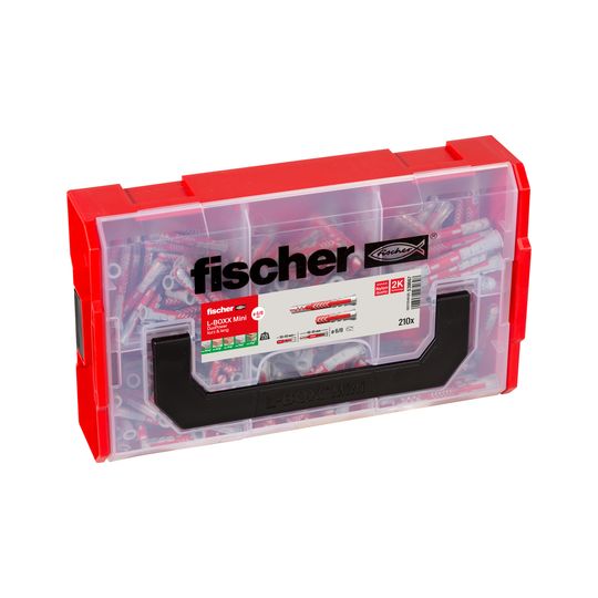 fischer FIXtainer - DUOPOWER; Bezeichnung: FIXtainer; Material Box: Kunststoff; Farbe Box: rot; Farbe Deckel: transparent; Ausstattung: Klick-Schließ-System,herausnehmbaren Trennelemente; Ausführung: DUOPOWER - Tiefenbiss-Box; Inhalt: 80 x DUOPOWER 6 x 30,