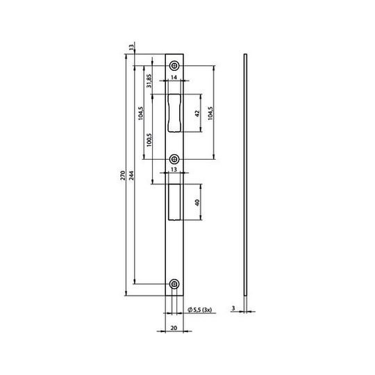 effeff Flachschließblech OneSystem N6500; Produkttyp: Flachschließblech; Produkttyp (Hersteller): Flachschließblech; Ausfräsung: mit Fallen und Riegelausschnitt; Material: Edelstahl; Einsatzbereich: Türrahmen; Form: kantig; DIN-Richtung: DIN Links-Rechts; Farbton: edelstahl; Oberfläche: geschliffen; Schließblechbreite: 24 mm; Schließblechlänge: 270 mm; Schließblechstärke: 3 mm