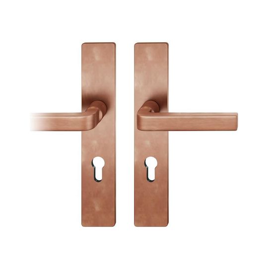 FSB Drückergarnitur 76 1004; Produkttyp: Drückergarnitur; Produkttyp (Hersteller): Drückergarnitur; Ausführung: Langschild; Befestigungsart: verdeckt verschraubt; Befestigungstechnik: mit Stütznocken; Form: eckig; Vierkant: 9 mm; Material: Bronze; Material Unterkonstruktion: Kunststoff-Edelstahl verstärkt; Form Türgriff (innen): Design; Form Türgriff (außen): Design; Breite Türgriff (innen): 19 mm; Breite Türgriff (außen): 19 mm; Länge Türgriff (innen): 133 mm; Länge Türgriff (außen): 133 mm; Höhe Türgriff (innen): 58 mm; Höhe Türgriff (außen): 58 mm; Schildbreite außen: 45 mm; Schildbreite innen: 45 mm; Schildlänge außen: 245 mm; Schildlänge innen: 245 mm; Schildstärke außen: 7 mm; Schildstärke innen: 7 mm; Lagerung: Ausgleichslager® 3,mit Rückholfeder,festdrehbar; Einsatzbereich: Objekttür; Türart: Vollblatt; Türwerkstoff: Holz,Stahl; Norm: DIN EN 1906,DIN 18273; Zulassung: für Rauchschutz,für Feuerschutz; Lochung: Profilzylinder gelocht; Entfernung: 72 mm; DIN-Richtung: DIN Links; Farbe: braun; Farbton: hellbronze; Oberfläche: patiniert gewachst; Design Türdrücker: David Chipperfield; Betätigungswinkel max.: 35 °; Türstärke min.: 39 mm; Türstärke max.: 48 mm