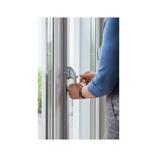 für nach innen öffnende Fenster und Fenstertüren mit Dreh- und Dreh/Kipp-Beschlägen, ideal für Terrassen- und Balkontüren bis 3,10 mtr. Höhe, Riegelstangen sind in verschiedenen Längen erhältlich, gleichschließend, ohne Stangenset, mit 2 Schlüsseln, für viele Doppelflügel-Fenster mit und ohne Mittelsteg, mit 7 mm Vierkant, Verschluss der Sicherung und des Fensters über den Griff, Totalverriegelung mittels Druckzylinder, öffnen mit dem Schlüssel nach Totalverriegelung, VdS anerkannt, DIN geprüft, Druckwiderstand über 1 Tonne je Sicherungspunkt, zwei Verriegelungspunkte (oben und unten), verkrallender Riegel, Abbildung mit Stangenset, Stangenset muss extra bestellt werden.