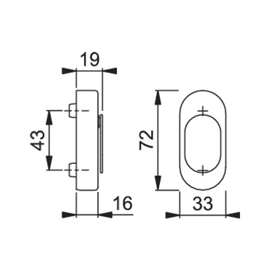 HOPPE Verdeckrosette U956V; Ausführung: mit Abdeckung; Material: Aluminium; Form Rosette: oval; Befestigungsart: verdeckt verschraubt; Befestigungstechnik: mit Stütznocken; Einsatzbereich: Fenster; Basis: Verdeckrosette; Nockendurchmesser: 10 mm; Sockelbreite: 33 mm; Sockelhöhe: 72 mm; Sockelstärke: 16 mm; Befestigungsabstand: 43 mm; Oberfläche: eloxiert; Farbton: naturfarbig; Abdeckung: drehbare Abdeckung; Form Abdeckung: oval