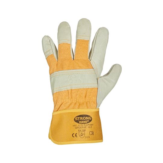 Aus hochwertigem Narbenleder, gefüttert, mit gelber gummierter Doppelnaht-Stulpe.
