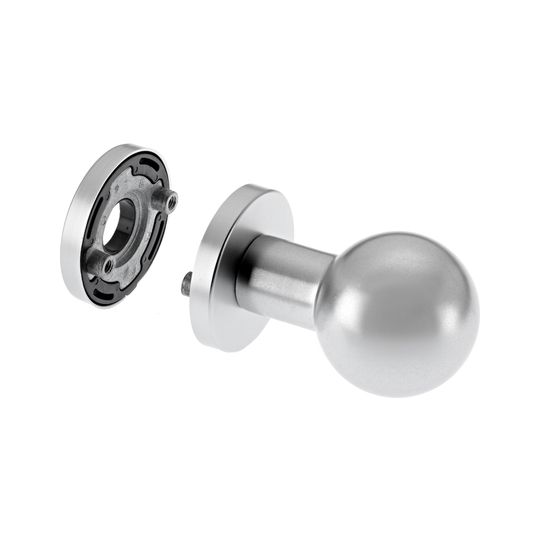 Türknopf festdrehbar auf Rosette Ø 55 mm zur gegenseitigen Verschraubung. Innenrosette mit Durchgangs-Nocken.