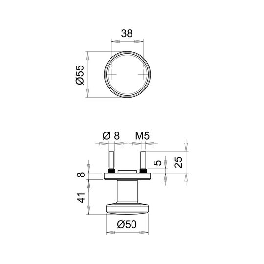 Türknopf festdrehbar auf Rosette Ø 55 mm zur gegenseitigen Verschraubung. Innenrosette mit Durchgangs-Nocken