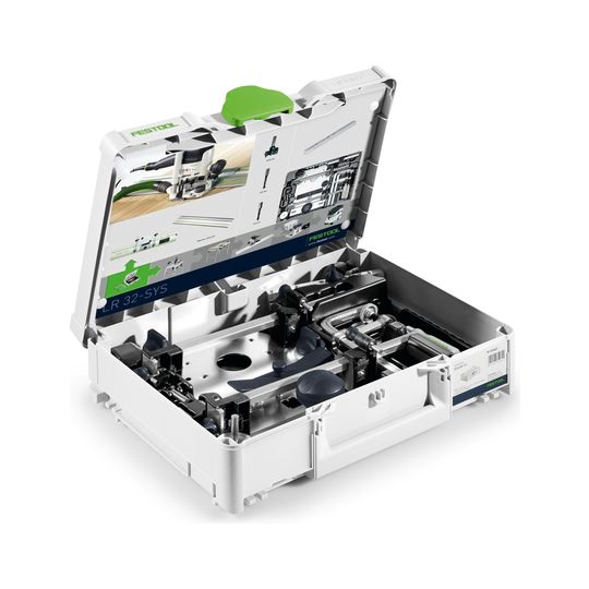 Führungsplatte, Zentrierdorn, HW-Beschlagbohrer Ø 35 mm, HW-Dübelbohrer Ø 5 mm (Dachform), HW-Dübelbohrer Ø 5 mm (mit Zentrierspitze und Vorschneider), 2 Seitenanschläge mit Anschlagreiter, Schraubzwingen FSZ 120 (2 Stück), Längenanschlag, Schraubendreher SW 5, Systainer SYS3 M 112