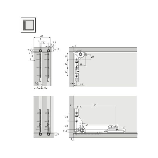 • Set enthält alle erforderlichen Komponenten für 1 ungedämpfte Schiebetür aus Holz- oder 55 mm Aluminiumrahmenprofilen