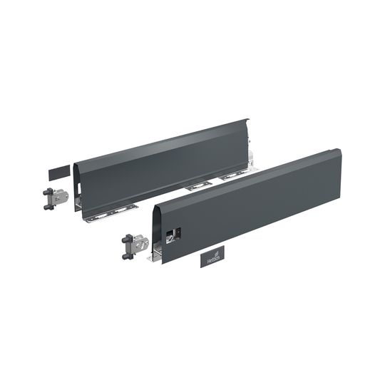 Set besteht aus:, 1 Stück Zarge, links und rechts, 2 Stück Frontbefestigungen für Zarge zum Einschlagen, 2 Stück Abdeckkappen, Kunststoff anthrazit mit Hettich Logo, Befestigungsmaterial
