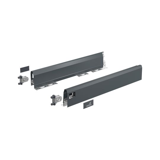 Set besteht aus:, 1 Stück Zarge, links und rechts, 2 Stück Frontbefestigungen für Zarge zum Einschlagen, 2 Stück Abdeckkappen, Kunststoff anthrazit mit Hettich Logo, Befestigungsmaterial