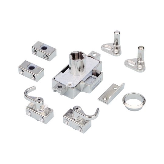 Mit Innenvierkant 7 x 7 mm, Rechts / links einstellbar, Inklusive einstellbarer Schlüsselabzugssperre, Vernickelt, Set besteht aus:, 1 Stück Drehstangenschloss mit Innenvierkant, rechts / links ein...