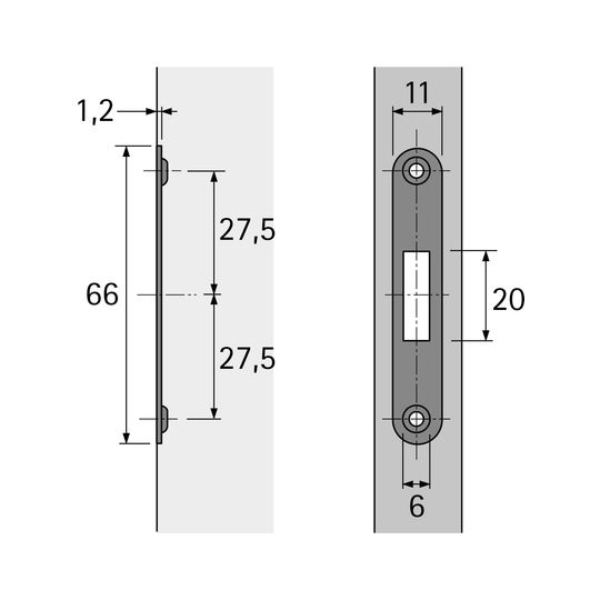 HETTICH Schließblech Typ 6195 46482; Befestigungsart: zum Einlassen; Ausführung: für Zylinderrolljalousiefallenschloss; Werkstoff: Stahl; Einsatzbereich: Möbelschloss; Breite: 11 mm; Länge: 66 mm; ...