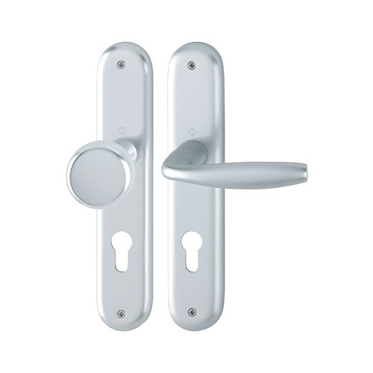 HOPPE Wechselgarnitur New York 53/273P/1810; Produkttyp: Wechselgarnitur; Produkttyp (Hersteller): Wechselgarnitur; Ausführung: Langschild; Befestigungsart: sichtbar verschraubt; Befestigungstechnik: ohne Stütznocken; Form: oval; Vierkant: 8 mm; Material: Aluminium; Form Türgriff (innen): gebogen; Form Türgriff (außen): Flachknopf; Ausführung Türgriff (außen): fest; Gewinde Knopf/Griffplatte: M12; Durchmesser Türgriff (außen): 53 mm; Länge Türgriff (innen): 127 mm; Höhe Türgriff (innen): 56 mm; Höhe Türgriff (außen): 43 mm; Schildbreite außen: 46 mm; Schildbreite innen: 46 mm; Schildlänge außen: 240 mm; Schildlänge innen: 240 mm; Schildstärke außen: 9 mm; Schildstärke innen: 9 mm; Lagerung: wartungsfreies Gleitlager,mit Rückholfeder; Einsatzbereich: Objekttür,Wohnungseingangstür; Türart: Vollblatt; Türwerkstoff: Holz,Stahl; Norm: DIN EN 1906; Lochung: Profilzylinder gelocht; Entfernung: 72 mm; DIN-Richtung: DIN Links-Rechts; Farbe: silber; Farbton: naturfarben; Oberfläche: eloxiert; Ausführung Vierkant: Rollenwechselstift; Türstärke min.: 37 mm; Türstärke max.: 42 mm