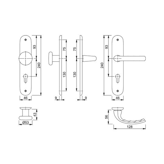 HOPPE Wechselgarnitur Tôkyô 53/273P/1710; Produkttyp: Wechselgarnitur; Produkttyp (Hersteller): Wechselgarnitur; Ausführung: Langschild; Befestigungsart: sichtbar verschraubt; Befestigungstechnik: ohne Stütznocken; Form: oval; Vierkant: 8 mm; Material: Aluminium; Form Türgriff (innen): gebogen; Form Türgriff (außen): Flachknopf; Ausführung Türgriff (außen): fest; Gewinde Knopf/Griffplatte: M12; Durchmesser Türgriff (außen): 53 mm; Länge Türgriff (innen): 128 mm; Höhe Türgriff (innen): 56 mm; Höhe Türgriff (außen): 43 mm; Schildbreite außen: 46 mm; Schildbreite innen: 46 mm; Schildlänge außen: 240 mm; Schildlänge innen: 240 mm; Schildstärke außen: 9 mm; Schildstärke innen: 9 mm; Lagerung: wartungsfreies Gleitlager,mit Rückholfeder; Einsatzbereich: Objekttür,Wohnungseingangstür; Türart: Vollblatt; Türwerkstoff: Holz,Stahl; Norm: DIN EN 1906; Lochung: Profilzylinder gelocht; Entfernung: 72 mm; DIN-Richtung: DIN Links-Rechts; Farbe: silber; Farbton: naturfarben; Oberfläche: eloxiert; Ausführung Vierkant: Rollenwechselstift; Türstärke min.: 37 mm; Türstärke max.: 47 mm
