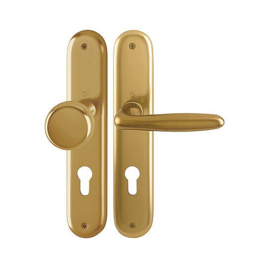 HOPPE Wechselgarnitur Verona 53/273P/1510; Produkttyp: Wechselgarnitur; Produkttyp (Hersteller): Wechselgarnitur; Ausführung: Langschild; Befestigungsart: sichtbar verschraubt; Befestigungstechnik: ohne Stütznocken; Form: oval; Vierkant: 8 mm; Material: Aluminium; Form Türgriff (innen): L-Form; Form Türgriff (außen): Flachknopf; Ausführung Türgriff (außen): fest; Gewinde Knopf/Griffplatte: M12; Durchmesser Türgriff (außen): 53 mm; Länge Türgriff (innen): 124 mm; Höhe Türgriff (innen): 55 mm; Höhe Türgriff (außen): 43 mm; Schildbreite außen: 46 mm; Schildbreite innen: 46 mm; Schildlänge außen: 240 mm; Schildlänge innen: 240 mm; Schildstärke außen: 9 mm; Schildstärke innen: 9 mm; Lagerung: wartungsfreies Gleitlager,mit Rückholfeder; Einsatzbereich: Objekttür,Wohnungseingangstür; Türart: Vollblatt; Türwerkstoff: Holz,Stahl; Norm: DIN EN 1906; Lochung: Profilzylinder gelocht; Entfernung: 72 mm; DIN-Richtung: DIN Links-Rechts; Farbe: braun; Farbton: bronzefarbig; Oberfläche: eloxiert; Ausführung Vierkant: Rollenwechselstift; Türstärke min.: 35 mm; Türstärke max.: 45 mm