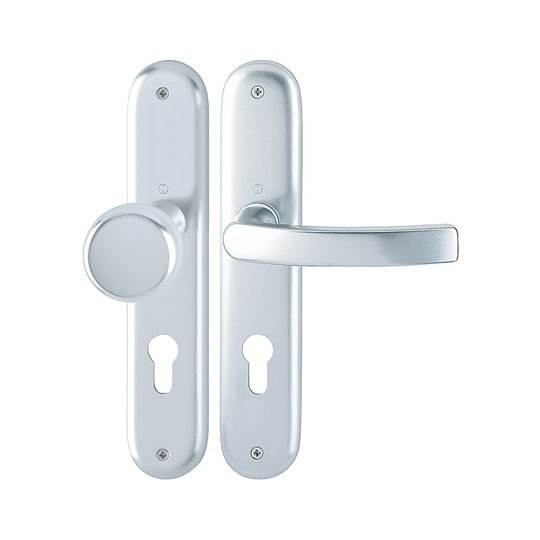 HOPPE Wechselgarnitur Luxembourg 53/273P/199; Produkttyp: Wechselgarnitur; Produkttyp (Hersteller): Wechselgarnitur; Ausführung: Langschild; Befestigungsart: sichtbar verschraubt; Befestigungstechnik: ohne Stütznocken; Form: oval; Vierkant: 8 mm; Material: Aluminium; Form Türgriff (innen): gebogen; Form Türgriff (außen): Flachknopf; Ausführung Türgriff (außen): fest; Gewinde Knopf/Griffplatte: M12; Durchmesser Türgriff (außen): 53 mm; Länge Türgriff (innen): 132 mm; Höhe Türgriff (innen): 58 mm; Höhe Türgriff (außen): 43 mm; Schildbreite außen: 46 mm; Schildbreite innen: 46 mm; Schildlänge außen: 240 mm; Schildlänge innen: 240 mm; Schildstärke außen: 9 mm; Schildstärke innen: 9 mm; Lagerung: mit Rückholfeder,wartungsfreies Gleitlager; Einsatzbereich: Objekttür,Wohnungseingangstür; Türart: Vollblatt; Türwerkstoff: Holz,Stahl; Norm: DIN EN 1906; Lochung: Profilzylinder gelocht; Entfernung: 72 mm; DIN-Richtung: DIN Links-Rechts; Farbe: silber; Farbton: naturfarben; Oberfläche: eloxiert; Ausführung Vierkant: Rollenwechselstift; Türstärke min.: 35 mm; Türstärke max.: 45 mm