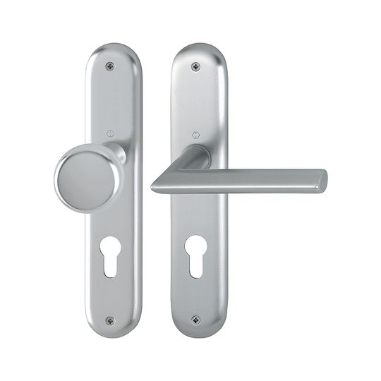 HOPPE Wechselgarnitur Stockholm 53/273P/1140; Produkttyp: Wechselgarnitur; Produkttyp (Hersteller): Wechselgarnitur; Ausführung: Langschild; Befestigungsart: sichtbar verschraubt; Befestigungstechnik: ohne Stütznocken; Form: oval; Vierkant: 8 mm; Material: Aluminium; Form Türgriff (innen): Gehrung; Form Türgriff (außen): Flachknopf; Ausführung Türgriff (außen): fest; Gewinde Knopf/Griffplatte: M12; Durchmesser Türgriff (außen): 53 mm; Länge Türgriff (innen): 132 mm; Höhe Türgriff (innen): 63 mm; Höhe Türgriff (außen): 43 mm; Schildbreite außen: 46 mm; Schildbreite innen: 46 mm; Schildlänge außen: 240 mm; Schildlänge innen: 240 mm; Schildstärke außen: 9 mm; Schildstärke innen: 9 mm; Lagerung: mit Rückholfeder,wartungsfreies Gleitlager; Einsatzbereich: Objekttür,Wohnungseingangstür; Türart: Vollblatt; Türwerkstoff: Holz,Stahl; Norm: DIN EN 1906; Lochung: Profilzylinder gelocht; Entfernung: 72 mm; DIN-Richtung: DIN Links-Rechts; Farbe: grau; Farbton: stahlfarbig; Oberfläche: eloxiert; Ausführung Vierkant: Rollenwechselstift; Türstärke min.: 35 mm; Türstärke max.: 45 mm