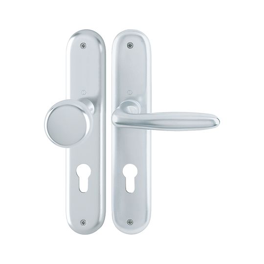 HOPPE Wechselgarnitur Verona 53/273P/1510; Produkttyp: Wechselgarnitur; Produkttyp (Hersteller): Wechselgarnitur; Ausführung: Langschild; Befestigungsart: sichtbar verschraubt; Befestigungstechnik: ohne Stütznocken; Form: oval; Vierkant: 8 mm; Material: Aluminium; Form Türgriff (innen): L-Form; Form Türgriff (außen): Flachknopf; Ausführung Türgriff (außen): fest; Gewinde Knopf/Griffplatte: M12; Durchmesser Türgriff (außen): 53 mm; Länge Türgriff (innen): 124 mm; Höhe Türgriff (innen): 55 mm; Höhe Türgriff (außen): 43 mm; Schildbreite außen: 46 mm; Schildbreite innen: 46 mm; Schildlänge außen: 240 mm; Schildlänge innen: 240 mm; Schildstärke außen: 9 mm; Schildstärke innen: 9 mm; Lagerung: wartungsfreies Gleitlager,mit Rückholfeder; Einsatzbereich: Objekttür,Wohnungseingangstür; Türart: Vollblatt; Türwerkstoff: Holz,Stahl; Norm: DIN EN 1906; Lochung: Profilzylinder gelocht; Entfernung: 72 mm; DIN-Richtung: DIN Links-Rechts; Farbe: silber; Farbton: naturfarben; Oberfläche: eloxiert; Ausführung Vierkant: Rollenwechselstift; Türstärke min.: 35 mm; Türstärke max.: 45 mm