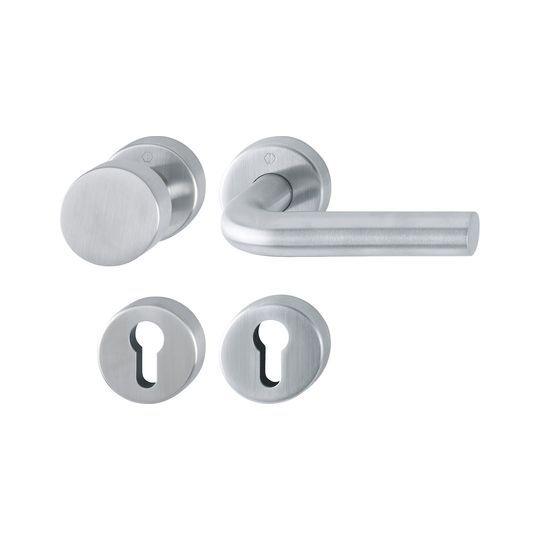 HOPPE Wechselgarnitur Bonn E58/42H/42HKVS/150; Produkttyp: Wechselgarnitur; Produkttyp (Hersteller): Wechselgarnitur; Ausführung: Rosette; Befestigungsart Drückerrosette (außen): verdeckt verschraubt; Befestigungsart Drückerrosette (innen): verdeckt verschraubt; Befestigungsart Schlüsselrosette (außen): verdeckt verschraubt; Befestigungsart Schlüsselrosette (innen): verdeckt verschraubt; Befestigungstechnik: mit Stütznocken; Form Drückerrosette: rund; Form Schlüsselrosette (außen): rund; Form Schlüsselrosette (innen): rund; Vierkant: 8 mm; Material: Edelstahl; Material Unterkonstruktion (Griffrosette): Stahl; Form Türgriff (innen): L-Form; Form Türgriff (außen): Flachknopf; Ausführung Türgriff (außen): fest; Gewinde Knopf/Griffplatte: M12; Durchmesser Türgriff (innen): 20; Durchmesser Türgriff (außen): 50; Durchmesser Schlüsselrosette: 52 mm; Länge Türgriff (innen): 130; Höhe Türgriff (innen): 66; Höhe Türgriff (außen): 32; Durchmesser Drückerrosette (außen): 52 mm; Durchmesser Drückerrosette (innen): 52 mm; Höhe Drückerrosette (außen): 10 mm; Höhe Drückerrosette (innen): 10 mm; Höhe Schlüsselrosette (außen): 10 mm; Höhe Schlüsselrosette (innen): 10 mm; Lagerung: wartungsfreies Gleitlager,mit Rückholfeder,festdrehbar; Einsatzbereich: Objekttür; Türart: Vollblatt; Türwerkstoff: Holz,Stahl; Lochung: Profilzylinder gelocht; DIN-Richtung: DIN Links-Rechts; Farbe: grau; Farbton: edelstahl matt; Material Unterkonstruktion (Schlüsselrosette): Kunststoff; Ausführung Vierkant: Rollenwechselstift; Türstärke min.: 40 mm; Türstärke max.: 45 mm; Norm: DIN EN 1906