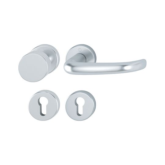 HOPPE Wechselgarnitur San Francisco 58/42KV/42KVS/1301; Produkttyp: Wechselgarnitur; Produkttyp (Hersteller): Wechselgarnitur; Ausführung: Rosette; Befestigungsart Drückerrosette (außen): verdeckt verschraubt; Befestigungsart Drückerrosette (innen): verdeckt verschraubt; Befestigungsart Schlüsselrosette (außen): verdeckt verschraubt; Befestigungsart Schlüsselrosette (innen): verdeckt verschraubt; Befestigungstechnik: mit Stütznocken; Form Drückerrosette: rund; Form Schlüsselrosette (außen): rund; Form Schlüsselrosette (innen): rund; Vierkant: 8 mm; Material: Aluminium; Form Türgriff (innen): gebogen; Form Türgriff (außen): Flachknopf; Ausführung Türgriff (außen): fest; Durchmesser Türgriff (außen): 50; Durchmesser Schlüsselrosette: 52 mm; Länge Türgriff (innen): 137; Höhe Türgriff (innen): 64; Höhe Türgriff (außen): 40; Durchmesser Drückerrosette (außen): 52 mm; Durchmesser Drückerrosette (innen): 52 mm; Höhe Drückerrosette (außen): 9 mm; Höhe Drückerrosette (innen): 9 mm; Höhe Schlüsselrosette (außen): 9 mm; Höhe Schlüsselrosette (innen): 9 mm; Lagerung: wartungsfreies Gleitlager,mit Rückholfeder; Einsatzbereich: Objekttür; Türart: Vollblatt; Türwerkstoff: Holz,Stahl; Lochung: Profilzylinder gelocht; DIN-Richtung: DIN Links-Rechts; Farbe: silber; Farbton: naturfarben; Oberfläche: eloxiert; Ausführung Vierkant: Vierkantstift; Türstärke min.: 37 mm; Türstärke max.: 42 mm; Norm: DIN EN 1906