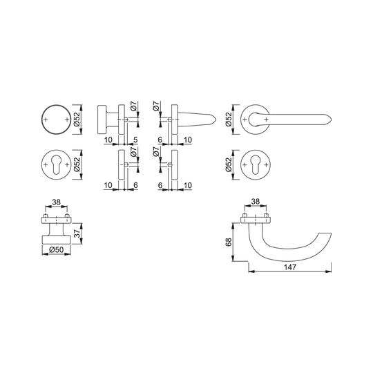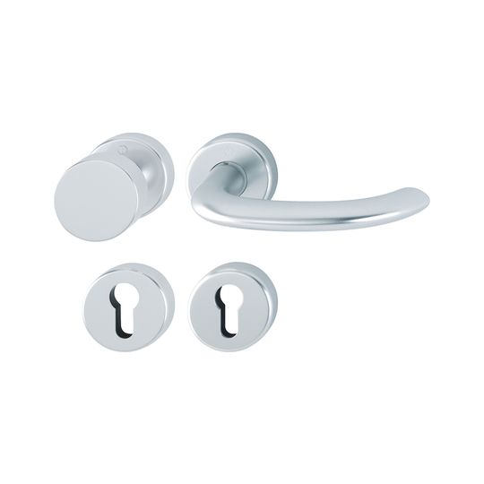 HOPPE Wechselgarnitur Marseille 58/42H/42HKVS/1138; Produkttyp: Wechselgarnitur; Produkttyp (Hersteller): Wechselgarnitur; Ausführung: Rosette; Befestigungsart Drückerrosette (außen): verdeckt verschraubt; Befestigungsart Drückerrosette (innen): verdeckt verschraubt; Befestigungsart Schlüsselrosette (außen): verdeckt verschraubt; Befestigungsart Schlüsselrosette (innen): verdeckt verschraubt; Befestigungstechnik: mit Stütznocken; Form Drückerrosette: rund; Form Schlüsselrosette (außen): rund; Form Schlüsselrosette (innen): rund; Vierkant: 8 mm; Material: Aluminium; Material Unterkonstruktion (Griffrosette): Stahl; Form Türgriff (innen): gebogen; Form Türgriff (außen): Flachknopf; Ausführung Türgriff (außen): fest; Gewinde Knopf/Griffplatte: M12; Durchmesser Türgriff (außen): 50; Durchmesser Schlüsselrosette: 52 mm; Länge Türgriff (innen): 147; Höhe Türgriff (innen): 68; Höhe Türgriff (außen): 37; Durchmesser Drückerrosette (außen): 52 mm; Durchmesser Drückerrosette (innen): 52 mm; Höhe Drückerrosette (außen): 10 mm; Höhe Drückerrosette (innen): 10 mm; Höhe Schlüsselrosette (außen): 10 mm; Höhe Schlüsselrosette (innen): 10 mm; Lagerung: wartungsfreies Gleitlager,mit Rückholfeder,festdrehbar; Einsatzbereich: Objekttür; Türart: Vollblatt; Türwerkstoff: Holz,Stahl; Lochung: Profilzylinder gelocht; DIN-Richtung: DIN Links-Rechts; Farbe: silber; Farbton: naturfarben; Oberfläche: eloxiert; Material Unterkonstruktion (Schlüsselrosette): Kunststoff; Ausführung Vierkant: Rollenwechselstift; Türstärke min.: 40 mm; Türstärke max.: 45 mm; Norm: DIN EN 1906