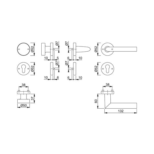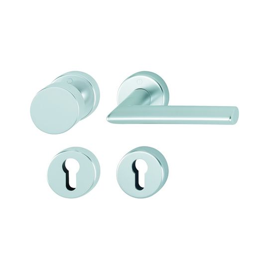 HOPPE Wechselgarnitur Stockholm 58/42H/42HKVS/1140; Produkttyp: Wechselgarnitur; Produkttyp (Hersteller): Wechselgarnitur; Ausführung: Rosette; Befestigungsart Drückerrosette (außen): verdeckt verschraubt; Befestigungsart Drückerrosette (innen): verdeckt verschraubt; Befestigungsart Schlüsselrosette (außen): verdeckt verschraubt; Befestigungsart Schlüsselrosette (innen): verdeckt verschraubt; Befestigungstechnik: mit Stütznocken; Form Drückerrosette: rund; Form Schlüsselrosette (außen): rund; Form Schlüsselrosette (innen): rund; Vierkant: 8 mm; Material: Aluminium; Material Unterkonstruktion (Griffrosette): Stahl; Form Türgriff (innen): Gehrung; Form Türgriff (außen): Flachknopf; Ausführung Türgriff (außen): fest; Gewinde Knopf/Griffplatte: M12; Durchmesser Türgriff (außen): 50; Durchmesser Schlüsselrosette: 52 mm; Länge Türgriff (innen): 132; Höhe Türgriff (innen): 60; Höhe Türgriff (außen): 37; Durchmesser Drückerrosette (außen): 52 mm; Durchmesser Drückerrosette (innen): 52 mm; Höhe Drückerrosette (außen): 10 mm; Höhe Drückerrosette (innen): 10 mm; Höhe Schlüsselrosette (außen): 10 mm; Höhe Schlüsselrosette (innen): 10 mm; Lagerung: wartungsfreies Gleitlager,mit Rückholfeder,festdrehbar; Einsatzbereich: Objekttür; Türart: Vollblatt; Türwerkstoff: Holz,Stahl; Lochung: Profilzylinder gelocht; DIN-Richtung: DIN Links-Rechts; Farbe: silber; Farbton: naturfarben; Oberfläche: eloxiert; Material Unterkonstruktion (Schlüsselrosette): Kunststoff; Ausführung Vierkant: Rollenwechselstift; Türstärke min.: 40 mm; Türstärke max.: 45 mm; Norm: DIN EN 1906