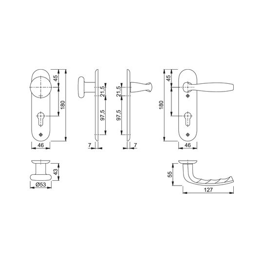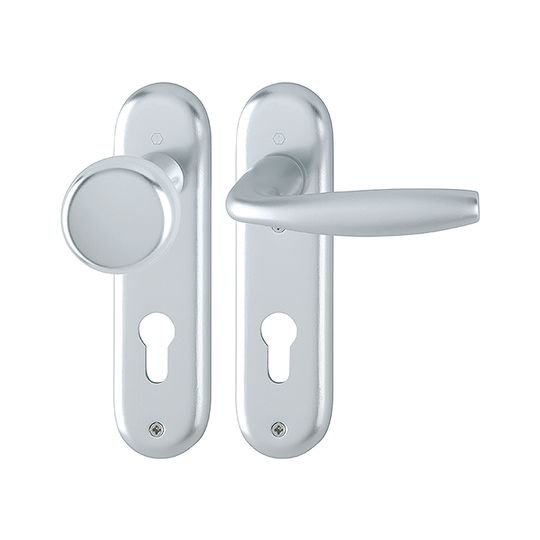 HOPPE Wechselgarnitur New York 53/273KP/1810; Produkttyp: Wechselgarnitur; Produkttyp (Hersteller): Wechselgarnitur; Ausführung: Kurzschild; Befestigungsart: sichtbar verschraubt; Befestigungstechnik: ohne Stütznocken; Form: oval; Vierkant: 8 mm; Material: Aluminium; Form Türgriff (innen): gebogen; Form Türgriff (außen): Flachknopf; Ausführung Türgriff (außen): fest; Gewinde Knopf/Griffplatte: M12; Durchmesser Türgriff (außen): 53 mm; Länge Türgriff (innen): 127 mm; Höhe Türgriff (innen): 55 mm; Höhe Türgriff (außen): 43 mm; Schildbreite außen: 46 mm; Schildbreite innen: 46 mm; Schildlänge außen: 180 mm; Schildlänge innen: 180 mm; Schildstärke außen: 9 mm; Schildstärke innen: 9 mm; Lagerung: wartungsfreies Gleitlager; Einsatzbereich: Objekttür,Wohnungseingangstür; Türart: Vollblatt; Türwerkstoff: Holz,Stahl; Norm: DIN EN 1906; Lochung: Profilzylinder gelocht; Entfernung: 72 mm; DIN-Richtung: DIN Links-Rechts; Farbe: silber; Farbton: naturfarben; Oberfläche: eloxiert; Ausführung Vierkant: Rollenwechselstift; Türstärke min.: 37 mm; Türstärke max.: 42 mm