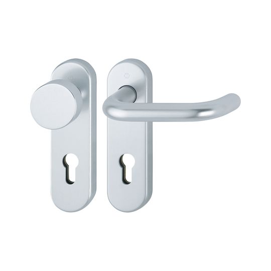 HOPPE Wechselgarnitur Paris 58/353KH/138; Produkttyp: Wechselgarnitur; Produkttyp (Hersteller): Wechselgarnitur; Ausführung: Kurzschild; Befestigungsart: verdeckt verschraubt; Befestigungstechnik: mit Stütznocken; Form: oval; Vierkant: 8 mm; Material: Aluminium; Material Unterkonstruktion: Stahl; Form Türgriff (innen): U-Form; Form Türgriff (außen): Flachknopf; Ausführung Türgriff (außen): fest; Gewinde Knopf/Griffplatte: M12; Durchmesser Türgriff (außen): 50 mm; Länge Türgriff (innen): 146 mm; Höhe Türgriff (innen): 65 mm; Höhe Türgriff (außen): 38 mm; Schildbreite außen: 45 mm; Schildbreite innen: 45 mm; Schildlänge außen: 166 mm; Schildlänge innen: 166 mm; Schildstärke außen: 10 mm; Schildstärke innen: 10 mm; Lagerung: mit Rückholfeder,wartungsfreies Gleitlager,festdrehbar; Einsatzbereich: Objekttür,Wohnungseingangstür; Türart: Vollblatt; Türwerkstoff: Holz,Stahl; Norm: DIN EN 1906; Lochung: Profilzylinder gelocht; Entfernung: 72 mm; DIN-Richtung: DIN Links-Rechts; Farbe: silber; Farbton: naturfarben; Oberfläche: eloxiert; Ausführung Vierkant: Rollenwechselstift; Türstärke min.: 40 mm; Türstärke max.: 45 mm