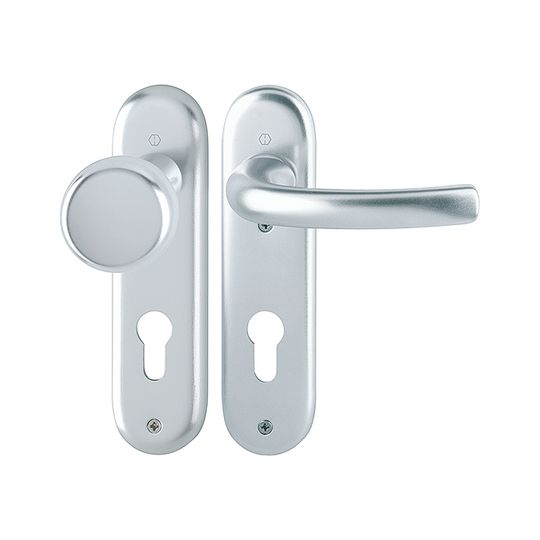 HOPPE Wechselgarnitur Tôkyô 53/273KP/1710; Produkttyp: Wechselgarnitur; Produkttyp (Hersteller): Wechselgarnitur; Ausführung: Kurzschild; Befestigungsart: sichtbar verschraubt; Befestigungstechnik: ohne Stütznocken; Form: oval; Vierkant: 8 mm; Material: Aluminium; Form Türgriff (innen): gebogen; Form Türgriff (außen): Flachknopf; Ausführung Türgriff (außen): fest; Gewinde Knopf/Griffplatte: M12; Durchmesser Türgriff (außen): 53 mm; Länge Türgriff (innen): 128 mm; Höhe Türgriff (innen): 55 mm; Höhe Türgriff (außen): 43 mm; Schildbreite außen: 46 mm; Schildbreite innen: 46 mm; Schildlänge außen: 180 mm; Schildlänge innen: 180 mm; Schildstärke außen: 7 mm; Schildstärke innen: 7 mm; Lagerung: wartungsfreies Gleitlager; Einsatzbereich: Objekttür,Wohnungseingangstür; Türart: Vollblatt; Türwerkstoff: Holz,Stahl; Norm: DIN EN 1906; Lochung: Profilzylinder gelocht; Entfernung: 72 mm; DIN-Richtung: DIN Links-Rechts; Farbe: silber; Farbton: naturfarben; Oberfläche: eloxiert; Ausführung Vierkant: Rollenwechselstift; Türstärke min.: 37 mm; Türstärke max.: 42 mm