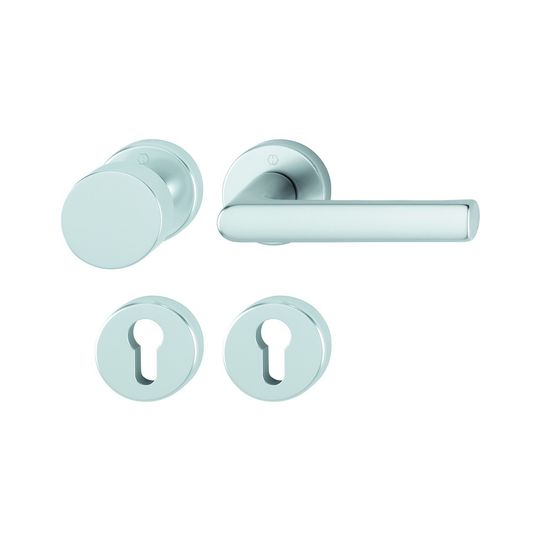 HOPPE Wechselgarnitur Hamburg 58/42KB/42KBS/1700; Produkttyp: Wechselgarnitur; Produkttyp (Hersteller): Wechselgarnitur; Ausführung: Rosette; Befestigungsart Drückerrosette (außen): aufsteckbar; Befestigungsart Drückerrosette (innen): aufsteckbar; Befestigungsart Schlüsselrosette (außen): aufsteckbar; Befestigungsart Schlüsselrosette (innen): aufsteckbar; Befestigungstechnik: mit Stütznocken; Form Drückerrosette: rund; Form Schlüsselrosette (außen): rund; Form Schlüsselrosette (innen): rund; Vierkant: 8 mm; Material: Aluminium; Form Türgriff (innen): L-Form; Form Türgriff (außen): Flachknopf; Durchmesser Türgriff (außen): 50; Durchmesser Schlüsselrosette: 52 mm; Länge Türgriff (innen): 129; Höhe Türgriff (innen): 51; Höhe Türgriff (außen): 40; Durchmesser Drückerrosette (außen): 52 mm; Durchmesser Drückerrosette (innen): 52 mm; Höhe Drückerrosette (außen): 9 mm; Höhe Drückerrosette (innen): 9 mm; Höhe Schlüsselrosette (außen): 9 mm; Höhe Schlüsselrosette (innen): 9 mm; Lagerung: wartungsfreies Gleitlager,mit Rückholfeder; Einsatzbereich: Objekttür; Türart: Vollblatt; Türwerkstoff: Holz,Stahl; Lochung: Profilzylinder gelocht; DIN-Richtung: DIN Links-Rechts; Farbe: silber; Farbton: naturfarben; Oberfläche: eloxiert; Ausführung Vierkant: Vierkantstift; Türstärke min.: 37 mm; Türstärke max.: 47 mm; Norm: DIN EN 1906