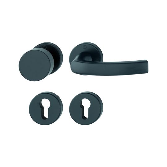 HOPPE Wechselgarnitur Luxembourg 58/42KB/42KBS/199; Produkttyp: Wechselgarnitur; Produkttyp (Hersteller): Wechselgarnitur; Ausführung: Rosette; Befestigungsart Drückerrosette (außen): aufsteckbar; Befestigungsart Drückerrosette (innen): aufsteckbar; Befestigungsart Schlüsselrosette (außen): aufsteckbar; Befestigungsart Schlüsselrosette (innen): aufsteckbar; Befestigungstechnik: mit Stütznocken; Form Drückerrosette: rund; Form Schlüsselrosette (außen): rund; Form Schlüsselrosette (innen): rund; Vierkant: 8 mm; Material: Aluminium; Form Türgriff (innen): gebogen; Form Türgriff (außen): Flachknopf; Ausführung Türgriff (außen): fest; Gewinde Knopf/Griffplatte: M12; Durchmesser Türgriff (außen): 50; Durchmesser Schlüsselrosette: 52 mm; Länge Türgriff (innen): 132; Höhe Türgriff (innen): 56; Höhe Türgriff (außen): 40; Durchmesser Drückerrosette (außen): 52 mm; Durchmesser Drückerrosette (innen): 52 mm; Höhe Drückerrosette (außen): 9 mm; Höhe Drückerrosette (innen): 9 mm; Höhe Schlüsselrosette (außen): 9 mm; Höhe Schlüsselrosette (innen): 9 mm; Lagerung: wartungsfreies Gleitlager,mit Rückholfeder; Einsatzbereich: Objekttür; Türart: Vollblatt; Türwerkstoff: Holz,Stahl; Lochung: Profilzylinder gelocht; DIN-Richtung: DIN Links-Rechts; Farbe: schwarz; Farbton: schwarz matt; Oberfläche: eloxiert; Ausführung Vierkant: Rollenwechselstift; Türstärke min.: 37 mm; Türstärke max.: 47 mm; Norm: DIN EN 1906