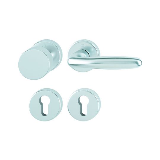 HOPPE Wechselgarnitur Verona 58/42KB/42KBS/1510; Produkttyp: Wechselgarnitur; Produkttyp (Hersteller): Wechselgarnitur; Ausführung: Rosette; Befestigungsart Drückerrosette (außen): aufsteckbar; Befestigungsart Drückerrosette (innen): aufsteckbar; Befestigungsart Schlüsselrosette (außen): aufsteckbar; Befestigungsart Schlüsselrosette (innen): aufsteckbar; Befestigungstechnik: mit Stütznocken; Form Drückerrosette: rund; Form Schlüsselrosette (außen): rund; Form Schlüsselrosette (innen): rund; Vierkant: 8 mm; Material: Aluminium; Form Türgriff (innen): L-Form; Form Türgriff (außen): Flachknopf; Ausführung Türgriff (außen): fest; Gewinde Knopf/Griffplatte: M12; Durchmesser Türgriff (außen): 50; Durchmesser Schlüsselrosette: 52 mm; Länge Türgriff (innen): 124; Höhe Türgriff (innen): 54; Höhe Türgriff (außen): 40; Durchmesser Drückerrosette (außen): 52 mm; Durchmesser Drückerrosette (innen): 52 mm; Höhe Drückerrosette (außen): 9 mm; Höhe Drückerrosette (innen): 9 mm; Höhe Schlüsselrosette (außen): 9 mm; Höhe Schlüsselrosette (innen): 9 mm; Lagerung: wartungsfreies Gleitlager,mit Rückholfeder; Einsatzbereich: Objekttür; Türart: Vollblatt; Türwerkstoff: Holz,Stahl; Lochung: Profilzylinder gelocht; DIN-Richtung: DIN Links-Rechts; Farbe: silber; Farbton: naturfarben; Oberfläche: eloxiert; Ausführung Vierkant: Rollenwechselstift; Türstärke min.: 37 mm; Türstärke max.: 47 mm; Norm: DIN EN 1906